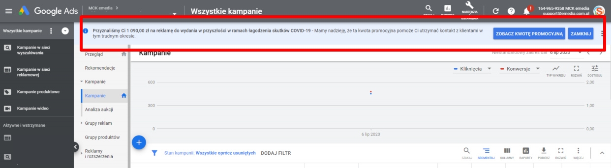Dofinansowanie budżetu reklamowego pojawia się na różnych kontach, bez względu na historię czy obsługę. Dlatego polecam sprawdzić na swoim koncie, czy otrzymali Państwo dodatkowe środki. Co ciekawe, są one przyznawane nawet na kontach – gdzie nie ma obecnie aktywnych reklam. Środki przyznane przez Google są dodawane automatycznie do budżetu kampanii reklamowych i wydawane na kliknięcia w pierwszej kolejności.