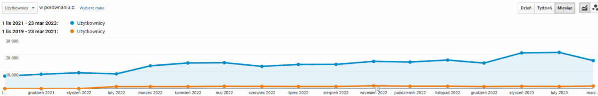 Porównując analogiczne okresy 18-tu miesięcy (lis-mar 2019/20/21 i lis-mar 21/22/23) według narzędzi analitycznych zaobserwowaliśmy wzrost ilości wejść z organicznych wyników wyszukiwania aż o 1361%. Jest to ogromny przeskok co widać wyraźnie na wykresie poniżej.